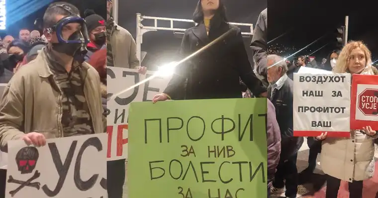 Во организација на Граѓанската иницијатива „Стоп за Усје“, вечерва во Скопје се одржа протест со блокада на крстосницата меѓу булеварите „Борис Трајковски“ и „Србија“. Сообраќајот беше привремено прекинат, а граѓаните јавно го искажаа својот револт поради, како што наведуваат, долгогодишното загадување на воздухот предизвикано од работењето на цементарата „Усје“.